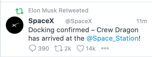 СТЫКОВКА ПОДТВЕРЖДЕНА ЭКИПАЖ ДРАКОНА ПРИБЫЛ НА МЕЖДУНАРОДНУЮ КОСМИЧЕСКУЮ СТАНЦИЮ $TSLA