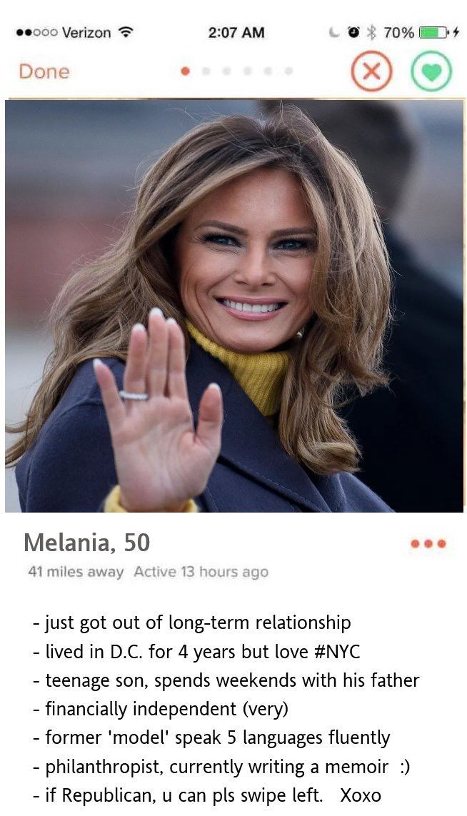 Только что закончила длительные отношения. Жила в Вашингтоне 4 года, но люблю Нью-Йорк. Есть сын тинейджер, который проводит выходые с отцом. Финансово независима (очень). Бывшая модель, говорю на 5 языках. Филантроп, в настоящее время пишу мемуары. Если Вы республиканец, пожалуйста, смахните влево (что значит отменить в Тиндере) хаха.