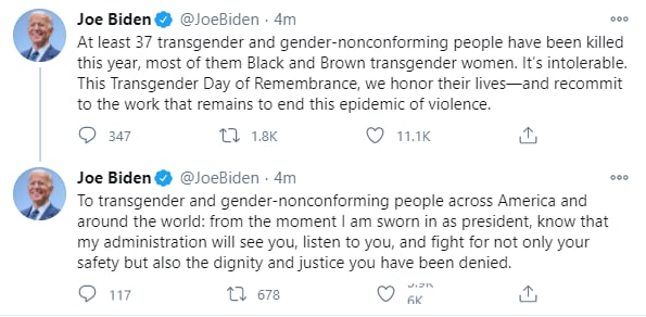 Трансгендерным и гендерно-нонконформистским людям по всей Америке и по всему миру: с того момента, как я принесу присягу в качестве президента, знайте, что моя администрация будет видеть вас, слышать вас и бороться не только за вашу безопасность, но и за достоинство и справедливость, в которых вам было отказано.