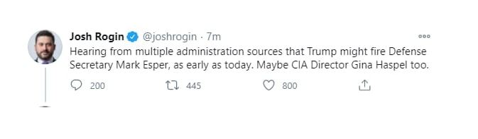 Узнал из нескольких источников администрации, что Трамп может уволить министра обороны Марка Эспера, уже сегодня. Может быть, директора ЦРУ Джина Хаспел тоже.