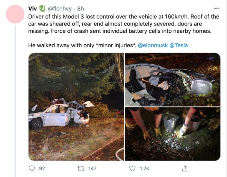 Твитт, на который ответит Маск сообщает: Водитель этой модели 3 не справился с управлением на скорости 160 км/ч. Крыша машины была срезана, задняя часть почти полностью оторвана, двери отсутствуют. Сила удара отправила отдельные аккумуляторные батареи в близлежащие дома.