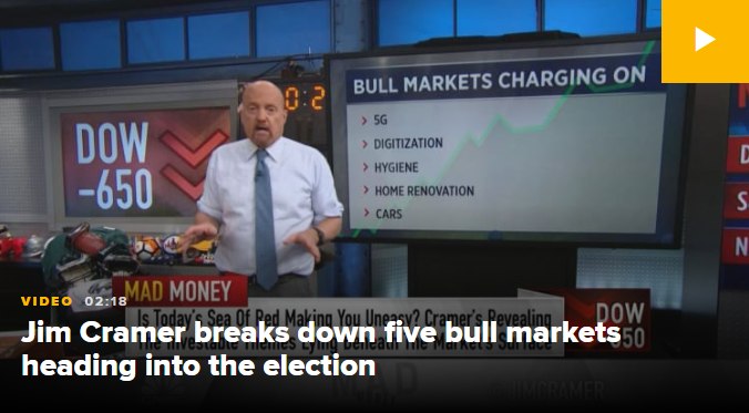 В условиях бушующего Covid и отсутствия стимулов здесь работает пять бычьих рынков: 5G, цифровизация, гигиена, ремонт дома и автомобили. Вы должны быть дисциплинированными и начать покупать их, пока они слабы, — сказал ведущий Mad Money.