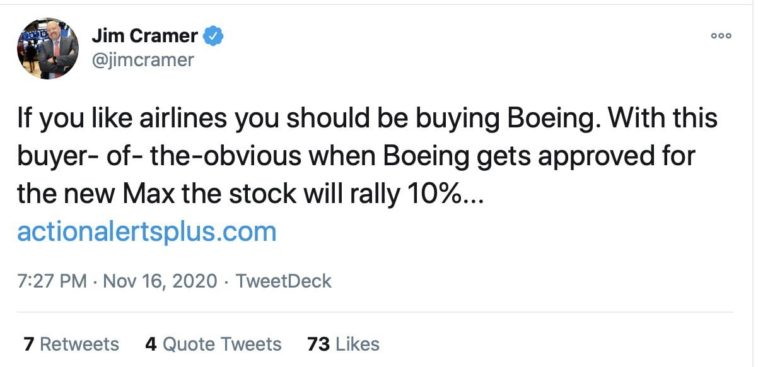 Крамер в Твиттере: Если вам нравятся авиакомпании, вы должны покупать Boeing $BA. Давайте предположим очевидное: когда Boeing получит одобрение на новый Макс, акции вырастут на 10