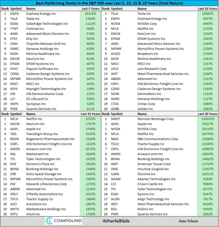 Лучшие акции SP 500 за последние 5, 10, 15 и 20 лет