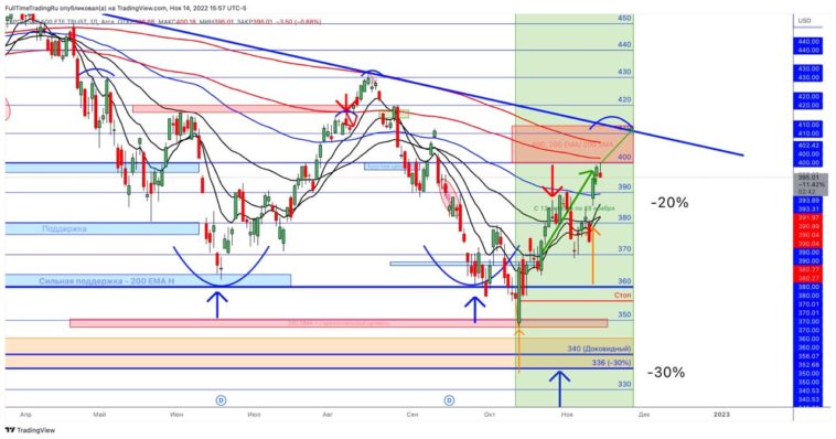 Мы точно не знаем пробьет ли SPY 400, чтобы коснуться 200 скользящей, но мы уже долшли до зоны сопротивления которую мы ждали (красный прямоугольник), поэтому будем осторожны в ожидании пуллбэка