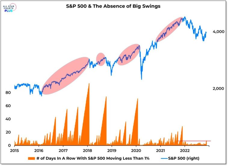 Сегодня был 7-й день подряд когда колебания индекса SP 500 не доходили до 1.