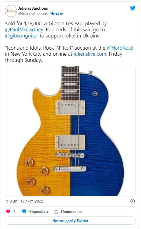 Сине-желтую гитару Пола Маккартни продали на аукционе за рекордную сумму, чтобы помочь Украине
