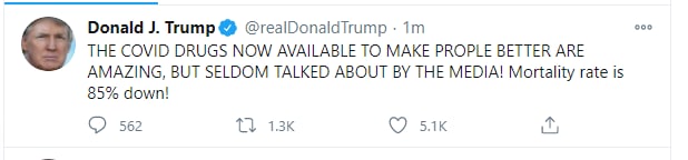 ТРАМП В ТВИТТЕРЕ: ЛЕКАРСТВА ОТ COVID, КОТОРЫЕ ТЕПЕРЬ ДОСТУПНЫ, ЧТОБЫ ОБЛЕГЧИТЬ ЛЮДЯМ БОЛЕЗНЬ, УДИВИТЕЛЬНЫ, НО РЕДКО УПОМИНАЮТСЯ В СРЕДСТВАХ МАССОВОЙ ИНФОРМАЦИИ СМЕРТНОСТЬ СНИЗИЛАСЬ НА 85
