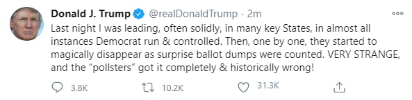 Вчера вечером я был лидером во многих ключевых штатах, почти во всех случаях управляемых и контролируемых демократами. Затем, один за другим, они начали волшебным образом исчезать, в то время как вбросы бюллетеней продолжились. Очень странно, и социологи поняли это совершенно и исторически неправильно