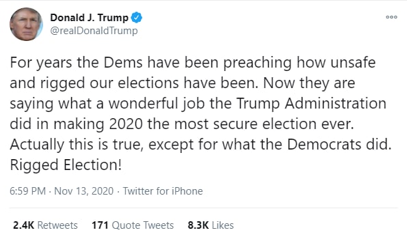 В течение многих лет демократы утверждали, насколько небезопасными и сфальсифицированными были наши выборы. Теперь они говорят: какая замечательная работа была проделана администрацией Трампа, чтобы сделать выборы 2020 года самыми безопасными в истории. Это действительно так, за исключением того, что сделали демократы. Фальсифицированные Выборы