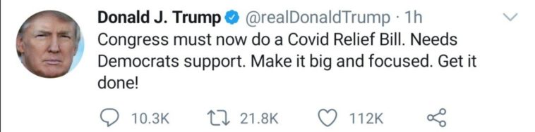 ТРАМП: Теперь Конгресс должен принять пакет помощи. Нужна поддержка демократов. Сделайте его большим и целенаправленным. Сделай это