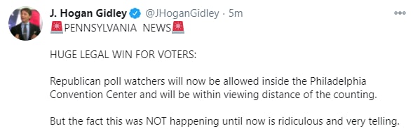 Республиканские наблюдатели за опросами теперь будут допущены в конференц-центр Филадельфии и будут находиться в пределах досягаемости для просмотра подсчета голосов.
