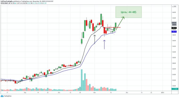 SNAP делает первый отскок от бычей скользящей 20 EMA после восходящего тренда и пробивает локальное сопротивление.