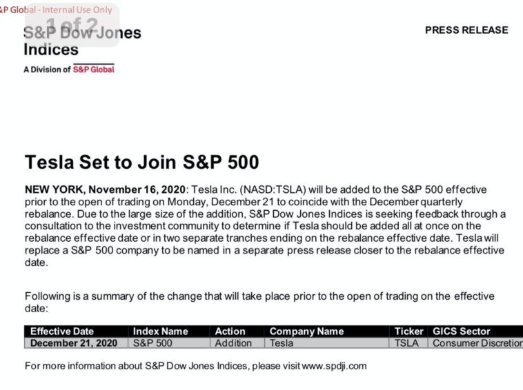 Индекс SP Dow Jones объявил в понедельник, что автопроизводитель будет добавлен в базовый индекс 21 декабря до начала торгов в понедельник. Исходя из цен закрытия понедельника, Tesla $TSLA войдет в число 10 самых ценных компаний в индексе.